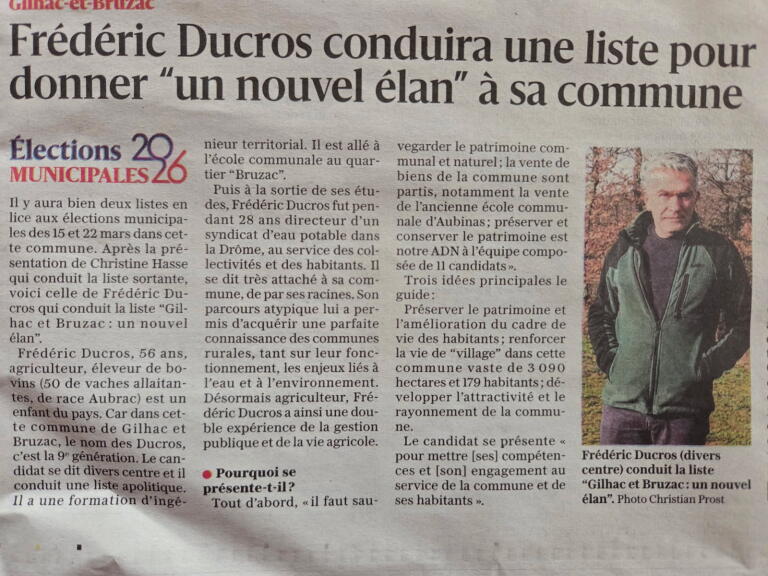 Dans le Dauphiné Libéré, découvrez l’article complet sur Frédéric Ducros et sa liste “Gilhac et Bruzac : un nouvel élan” pour les municipales 2026, avec ses ambitions, son projet et ce qu’il souhaite pour l’avenir de la commune.